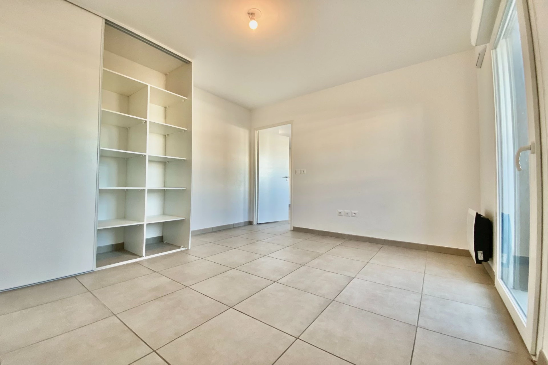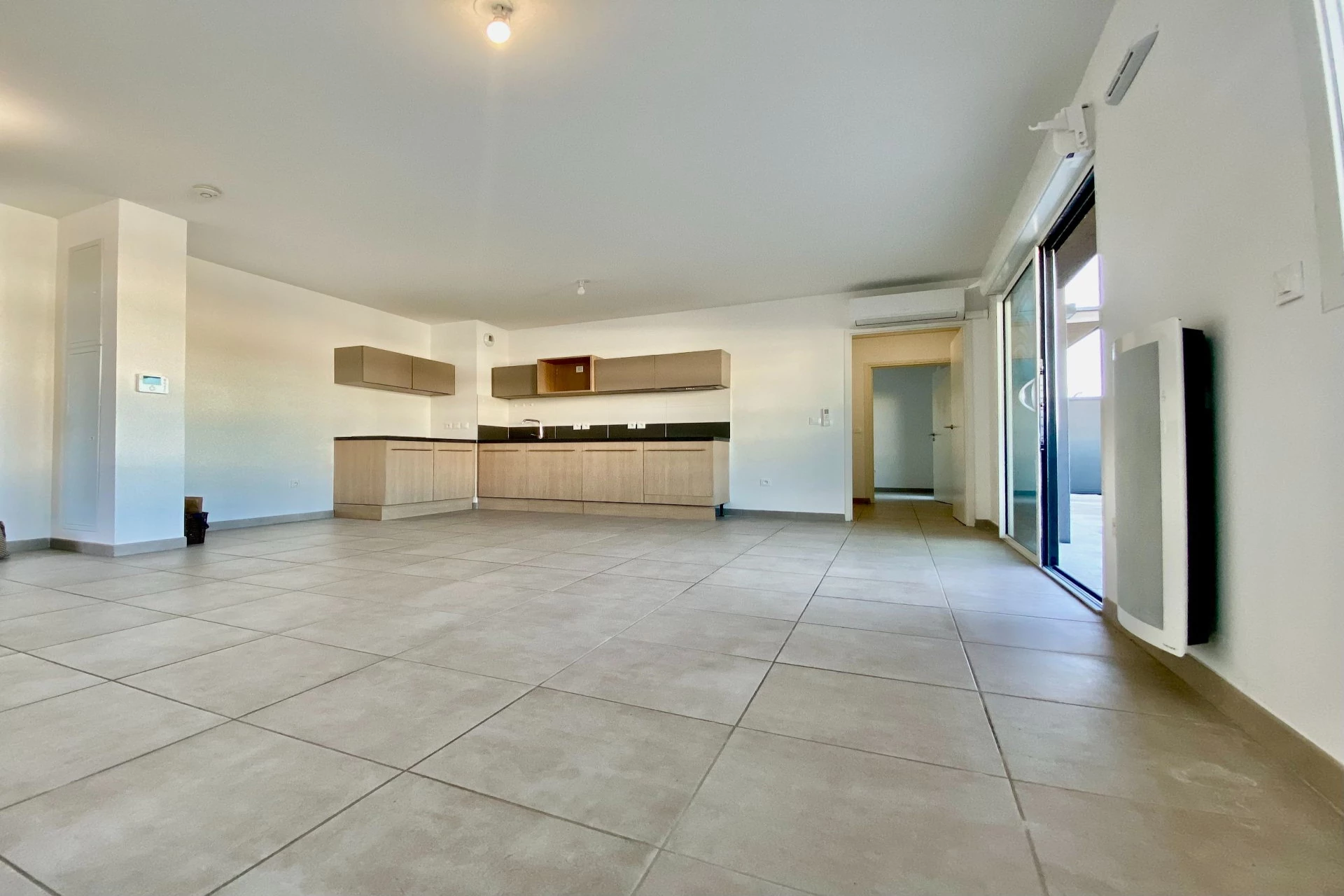 L'appartement, situé au troisième étage avec ascenseur, se compose d'une belle pièce à vivre climatisée ouverte sur l'immense terrasse, d'une cuisine américaine équipée (plaques, hotte), ainsi que de deux chambres avec placards intégrés. Ce bien est équipé d'une salle d'eau avec douche à l'italienne et WC.