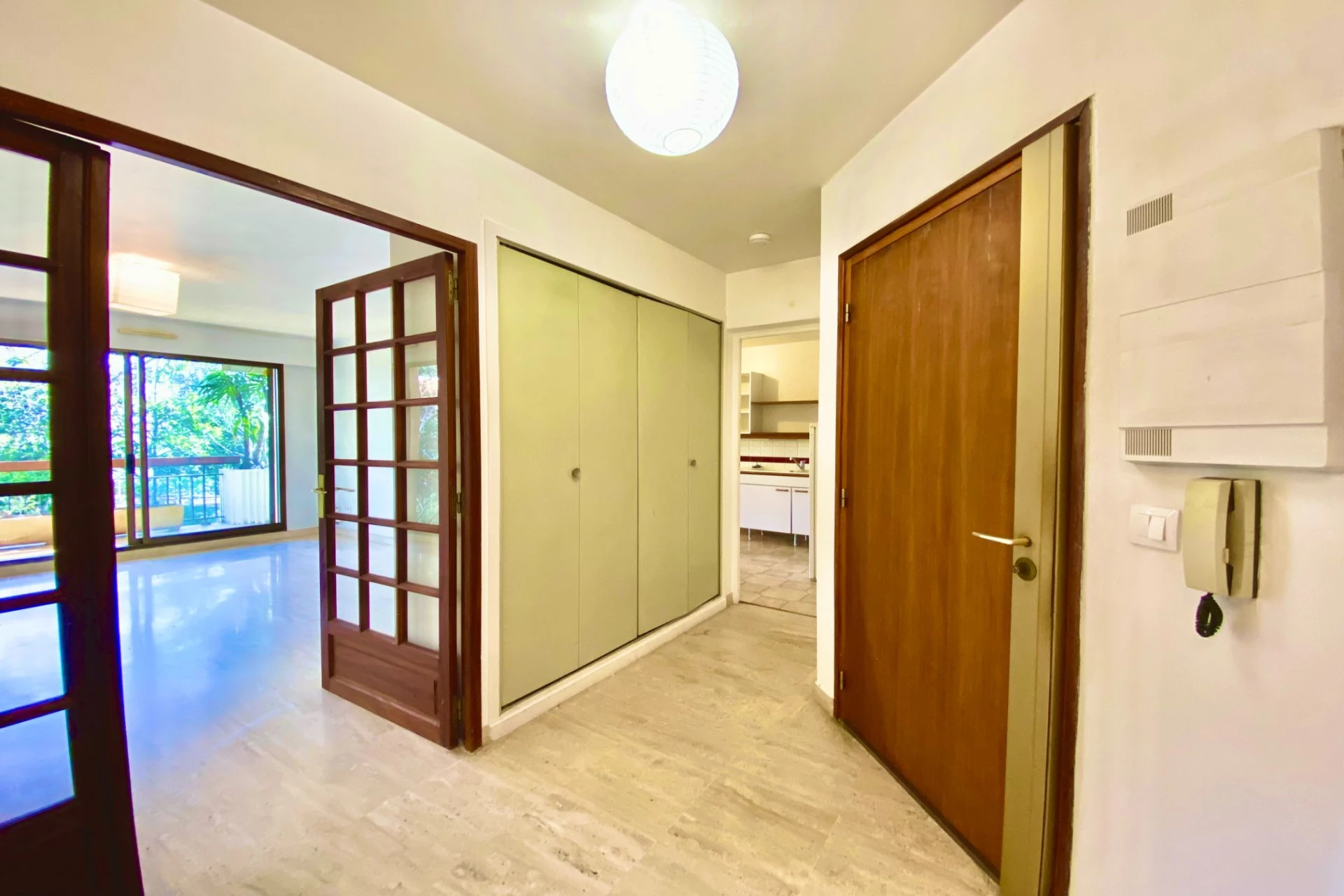L'appartement se compose d'une entrée avec grand placard, une cuisine indépendante aménagée et équipée (plaques vitro, hotte, placard, four, frigo), une belle pièce à vivre ouverte sur la terrasse, 2 chambres dont l'une avec placards intégrés, une salle de bain, WC indépendant.